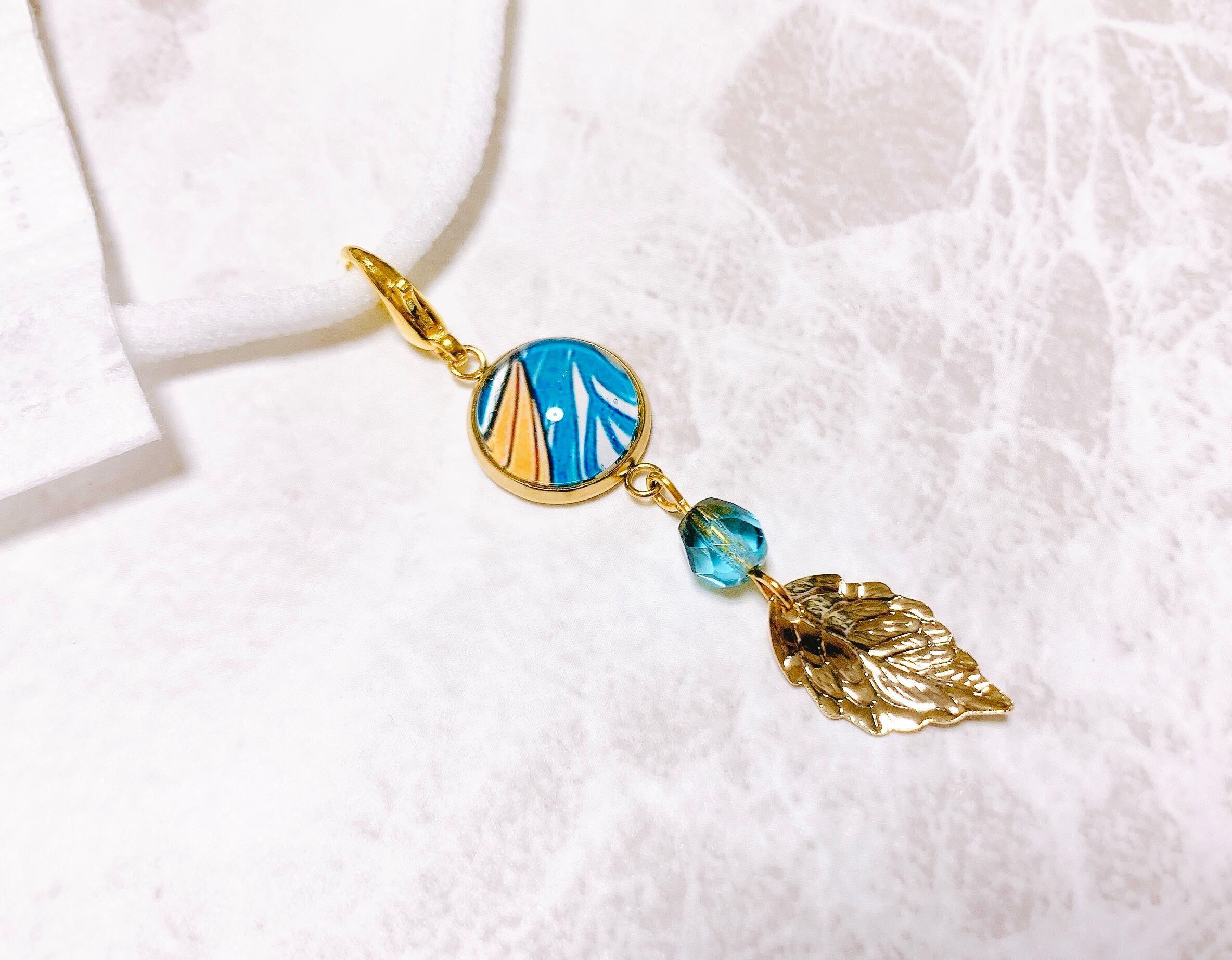夏に向けてボタニカル柄のパーツを作り、爽やかなブルー×ゴールドで仕上げました* ੈ✩‧₊˚